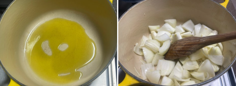 2. 깊은 냄비에 올리브오일2T를 둘러 준 뒤 냄비를 달궈 주고 양파를 넣고 볶아주세요.