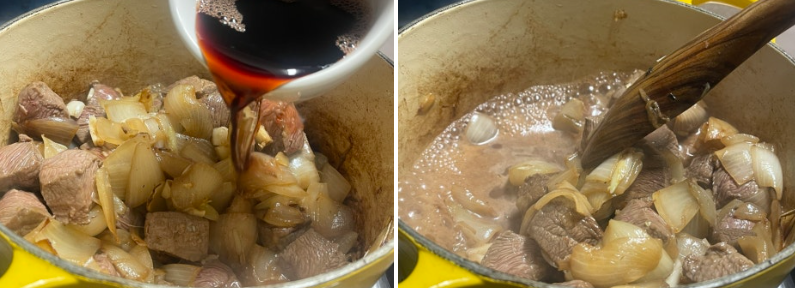 4. 소고기 겉면이 골고루 익으면 레드와인 1컵을 넣고 센 불에서 알콜을 날려 주세요.