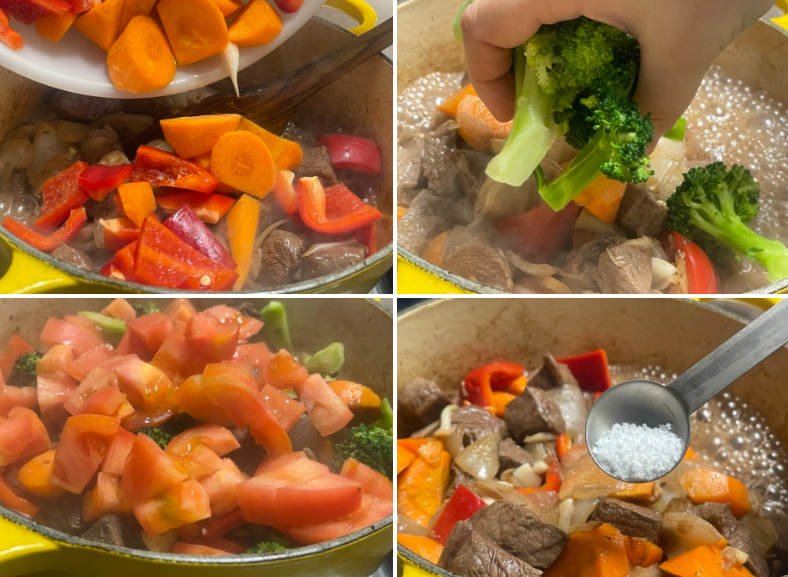 5. 알코올 향이 없어지면 썰어 놓은 파프리카와 당근, 토마토, 브로콜리, 소금 1/2tsp을 넣어 주세요.